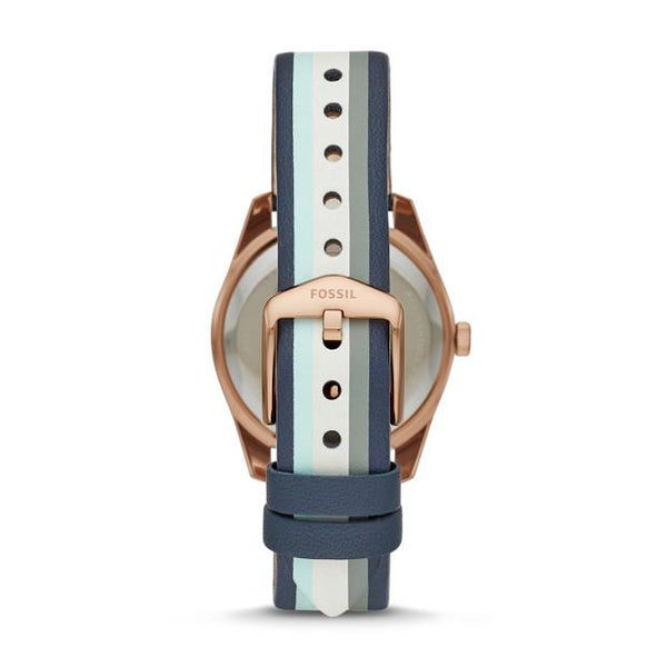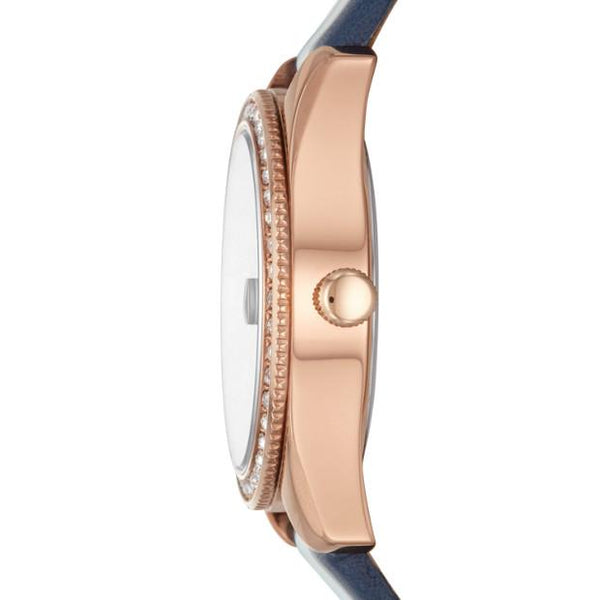 This 32mm Scarlette Mini features a blue sunray dial with a glitz bezel, three-hand date movement and a striped navy leather strap.