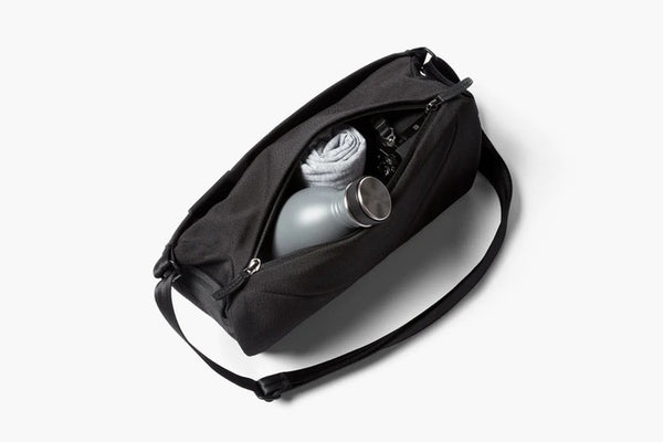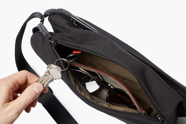 - Main compartment with soft-lined sunglasses pouch and key clip