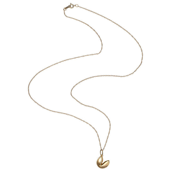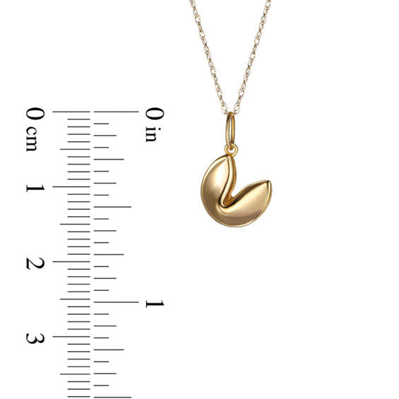 This polished fortune cookie pendant is fashioned in 10K gold. The rope chain measures 16 inches in length and secures with a spring-ring clasp.