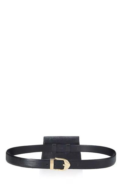 The versatile Tilsitt belt bag, rendered in black striated Epi leather, features a convertible strap that can be worn as both a belt bag and a clutch. Size 110/44. Belt measures 39-43"