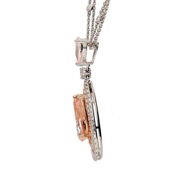 14K white and rose gold drop necklace with one 7x12 millimeter pear shaped morganite, one 5x7 millimeter pear shaped morganite and 77 round brilliant cut diamonds weighing approximately 1/2 ct. tw.