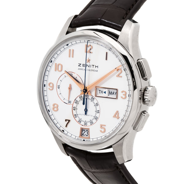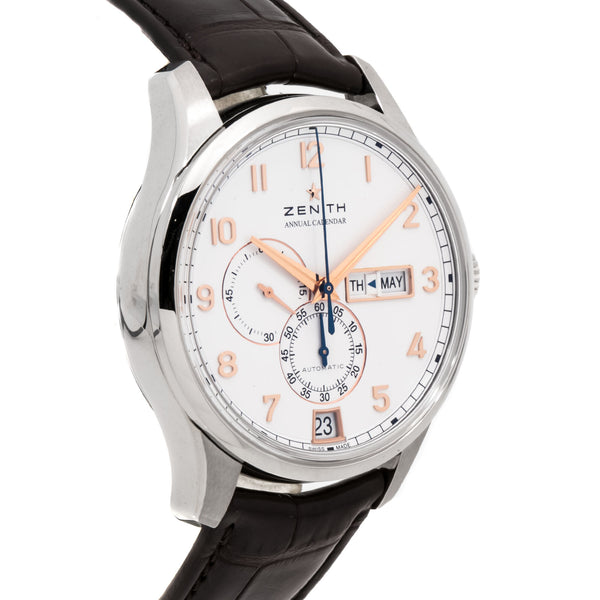 Pre-Owned Zenith Captain Winsor Annual Calendar (0322072405401C711) self-winding automatic watch, features a 42mm stainless steel case surrounding a white dial on a on a brown alligator strap with a stainless steel deployant buckle. Functions include, hours, minutes, small-seconds, day, date. month and annual calendar. This watch comes complete with box and papers.