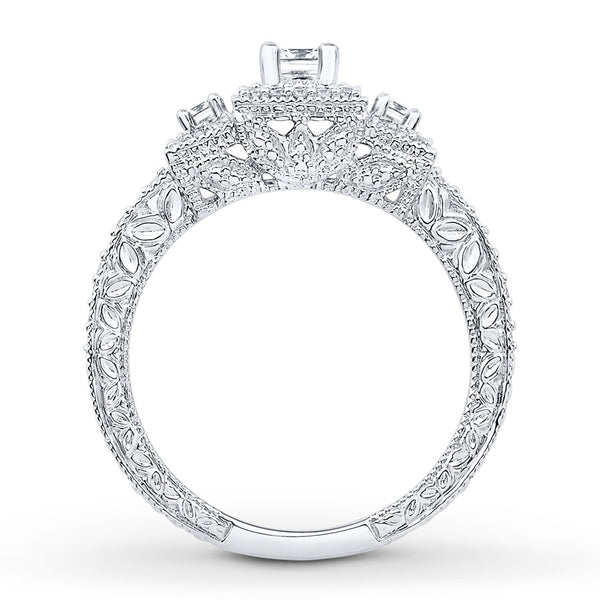 This exquisite engagement ring for her features three princess-cut diamonds complemented by shimmering round diamonds and fancy milgrain detailing. The ring is styled in 14K white gold and has a total diamond weight of 3/8 carat. Diamond Total Carat Weight may range from .37 - .44 carats.