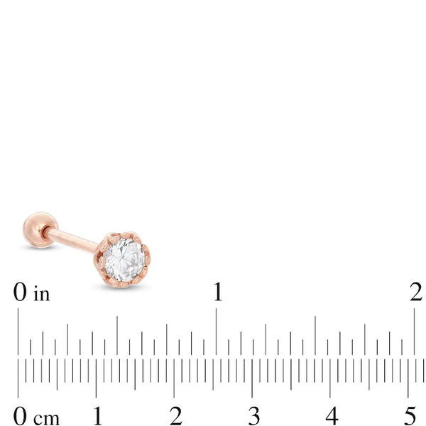 This 014 gauge 7mm cubic zirconia solitaire flower barbell is set in rose ion-plated stainless steel, measures 5/8 of an inch and secures with a 5mm ball closure.