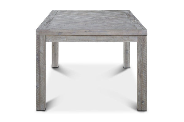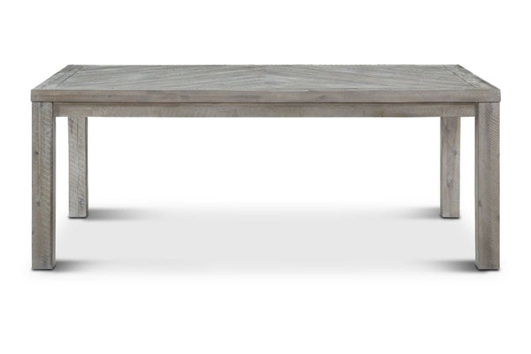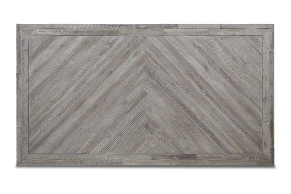 - Roughhewn, solid Acacia wood gives the Allister Collection its distinguished, refined look. The Allister combines artisanal, authentic details with a modern profile and craftsmanship. Each hand-selected plank is sanded, stained, and whitewashed to create an alluring driftwood cast that underscores the active wood grain and gives prominence to the natural saw marks and knots created during the milling process. These solid planks are mounted in a herringbone pattern to a plywood backing board to ensure a tight and secure design. The Allister Dining Table is ideal for 6-8 people.