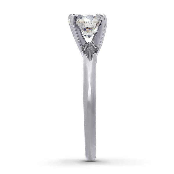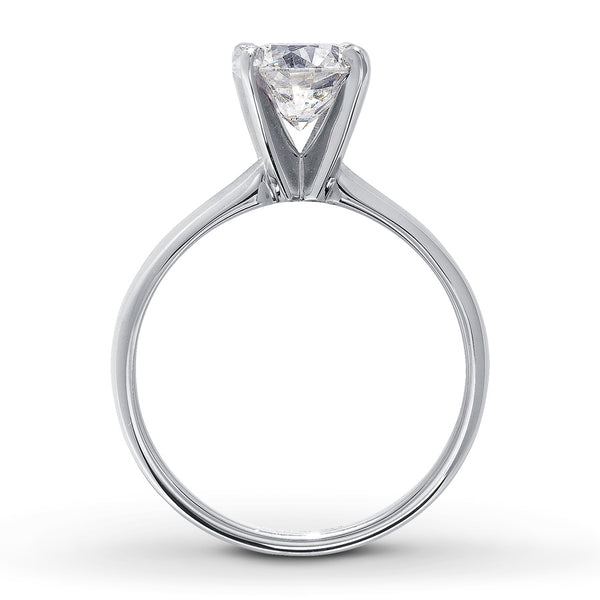 This stunning diamond solitaire ring features an impressive diamond in a band of 14K white gold with high-polish finish. The independently certified round diamond is 1 1/2 carats and has been laser-inscribed with a unique Gemscribe® serial number. From the Now & Forever® Bridal Collection. Diamond Total Carat Weight may range from 1.45 - 1.57 carats.