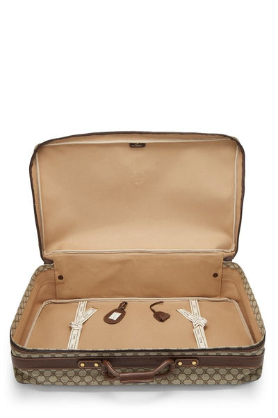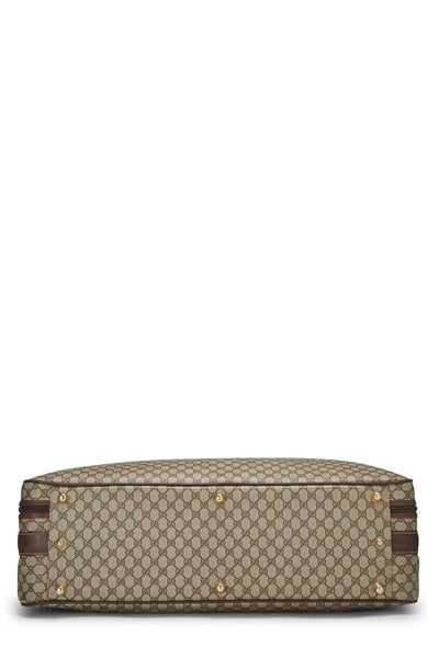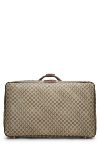 Chic oversize Gucci suitcase crafted in the house's Original GG Supreme coated canvas, featuring brown leather trim and accented with the iconic red and green striped Web details.