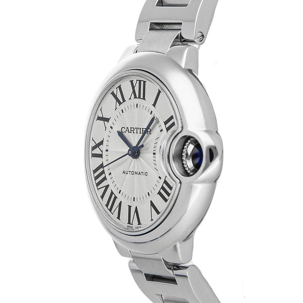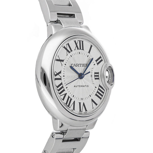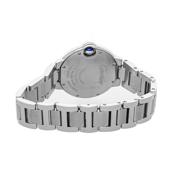 Pre-Owned Cartier Ballon Bleu de Cartier (W6920071) self-winding automatic watch, features a 33mm stainless steel case surrounding a silver dial on a stainless steel bracelet with folding buckle. Functions include hours, minutes and seconds. This watch does not come with box or papers.