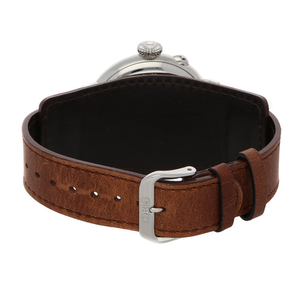 Pre-Owned Oris Big Crown 1917 Limited Edition (0173277364081SetLS) self-winding automatic watch, features a 40mm stainless steel case surrounding a grey dial on a brown leather Bundt strap with a stainless steel tang buckle. Functions include hours and minutes. This watch comes complete with box and papers.