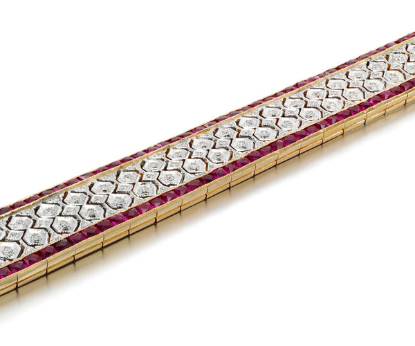 The articulated open work links set with brilliant-cut diamonds, between borders set with calibré-cut rubies, length approximately 183mm.