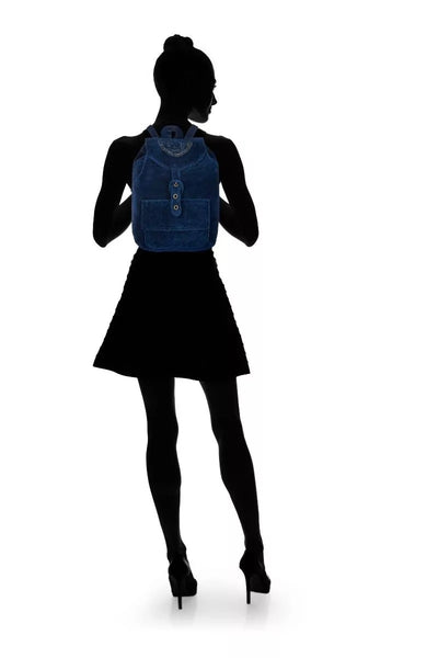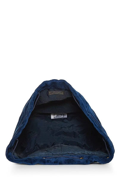Hit the beach in style with this Versace backpack, rendered in a navy blue terry cloth and accented with a gold stitched Medusa head motif at the flap